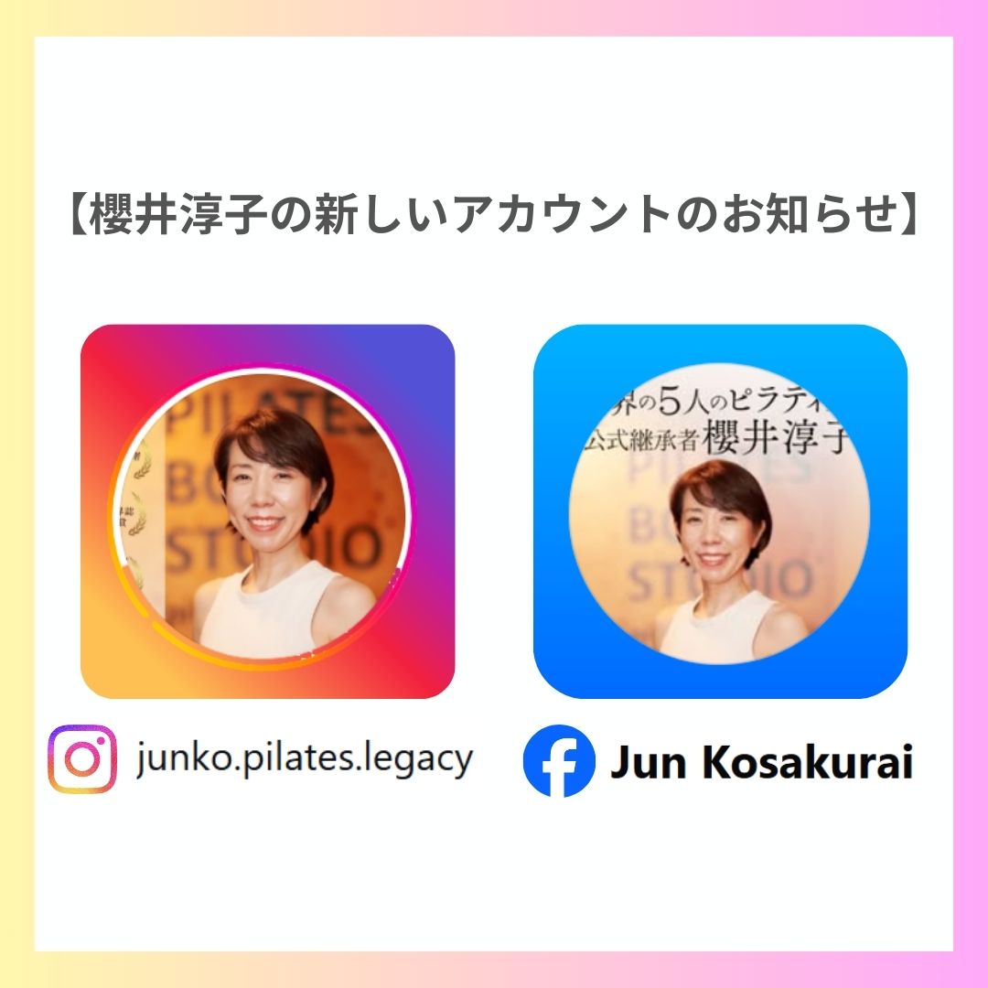 たくさんの方にご好評をいただいていた第二世代ピラティスティーチャー櫻井淳子のSNSアカウントが新しくなりました。… たくさんの方にご好評をいただいていた第二世代ピラティスティーチャー櫻井淳子のSNSアカウントが新しくなりました。…